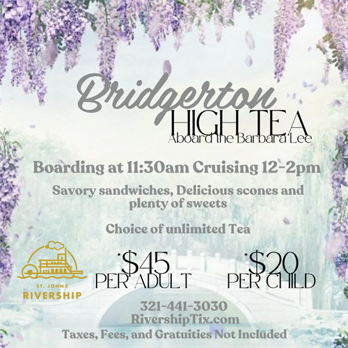 Step into the elegance and romance of Bridgerton aboard the Barbara Lee for a refined High Tea Cruise! This two-hour journey along the scenic St. Johns River invites you to indulge in Regency-era charm, delightful conversation, and picturesque waterfront views.
