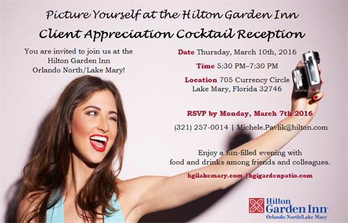 You're invited to attend the Hilton Garden Inn Orlando North/Lake Mary's Client Appreciation Cocktail Reception and Open House! There will be complimentary hors d'ouerves, beer, wine, and cocktails served as well as great networking opportunities with members of the local business community. RSVP to Michele Pavlik by Monday, March 7th. We hope to see you there!