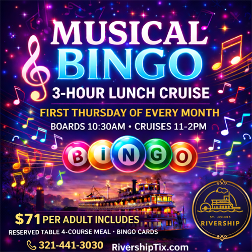 Join us aboard the Barbara Lee for a lively and interactive Musical Bingo Cruise! Test your musical knowledge, compete for fantastic prizes, and enjoy a unique, music-filled experience on the St. Johns River.
