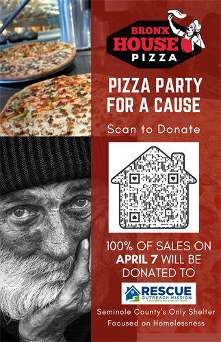 On Tuesday, April 7, Bronx House Pizza in Lake Mary will donate 100% of the day’s sales — including dine-in, takeout, delivery, and gift cards — to Rescue Outreach Mission. This is the third annual event, and the community goal is $15,000 in sales. Eat pizza. Change lives—all day long at Bronx House Pizza in Lake Mary.