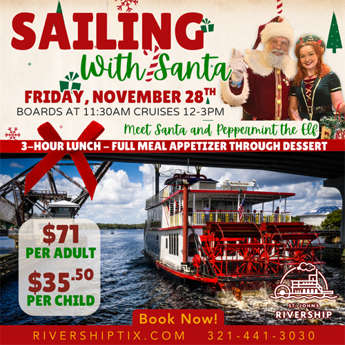 Skip the long lines and holiday stress this Black Friday and join us for a festive cruise on the beautiful St. Johns River and Lake Monroe aboard the Barbara Lee, departing from Historic Downtown Sanford, Florida.
