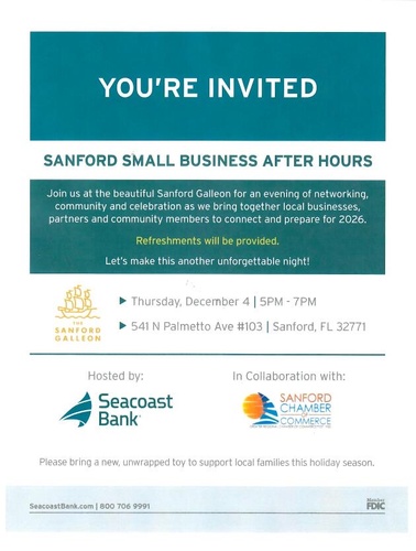 Join us for an evening of networking, community, and celebration as Seacoast Bank partners with the Sanford Chamber of Commerce to host our 3rd Annual Sanford Small Business After Hours!