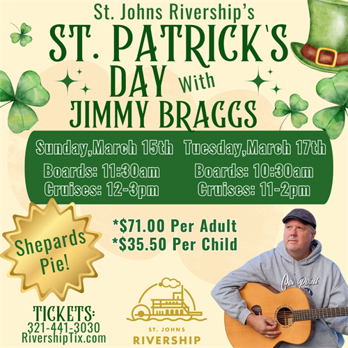 We’re thrilled to announce that Jimmy Bragg will be providing live entertainment aboard the Barbara Lee, making this St. Patrick’s Day extra special. Guests can enjoy our full menu, plus a special holiday entrée choice of Shepherd’s Pie, green beer, and a full bar available for purchase.